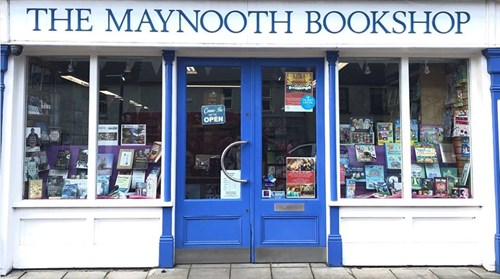 Photograph courtesy of The Maynooth Bookshop – shows the front of the shop with blue doors and windows displaying books either side.