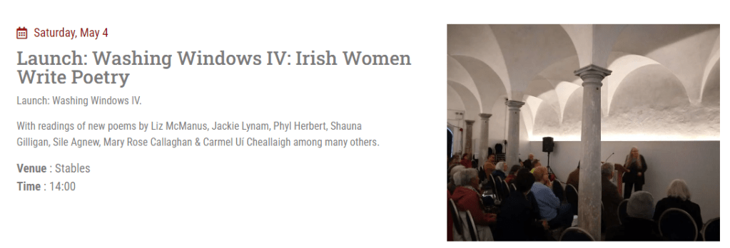 Washing Windows IV: Irish Women Write Poetry will be launched with readings by contributors on Saturday May 4th at the brilliant Strokestown International Poetry Festival.